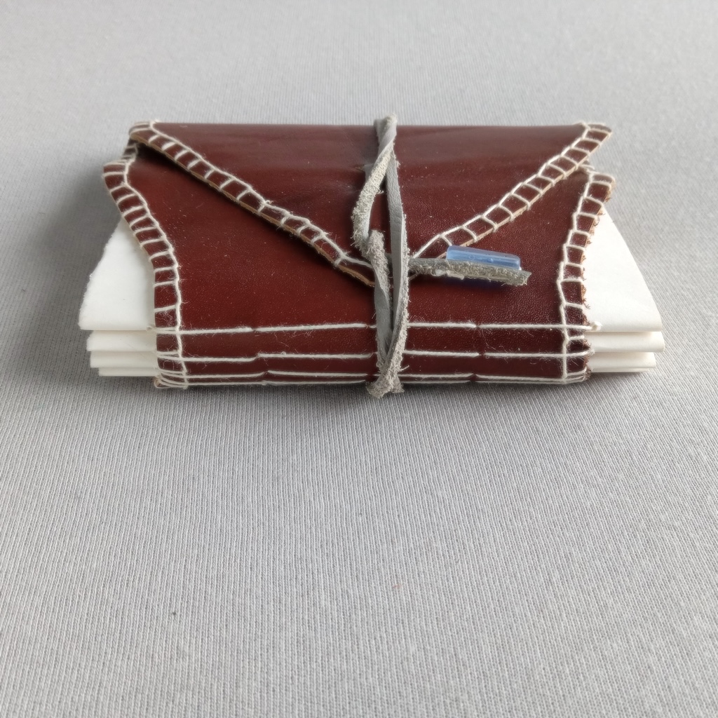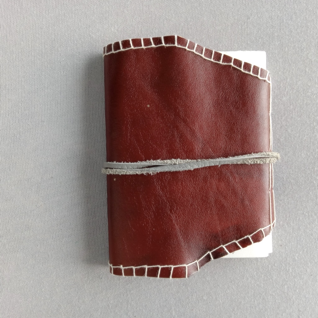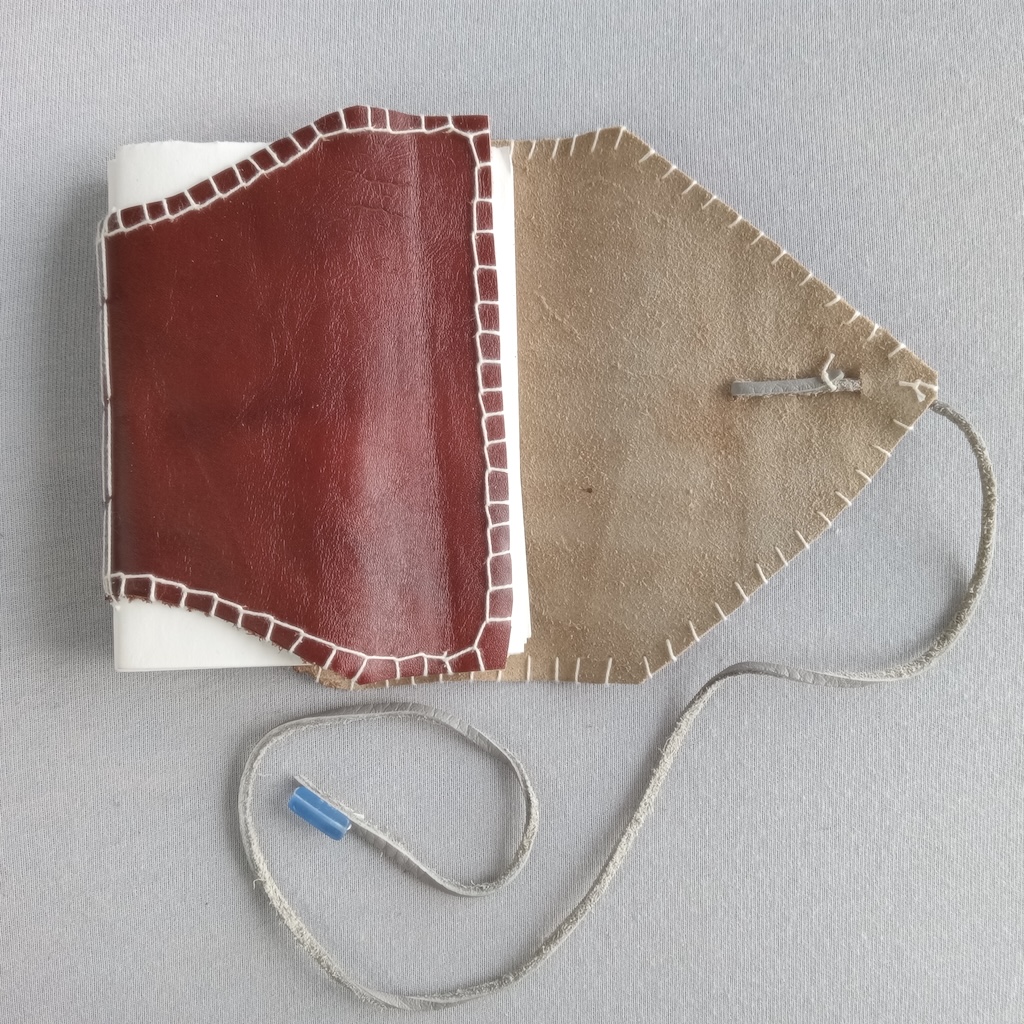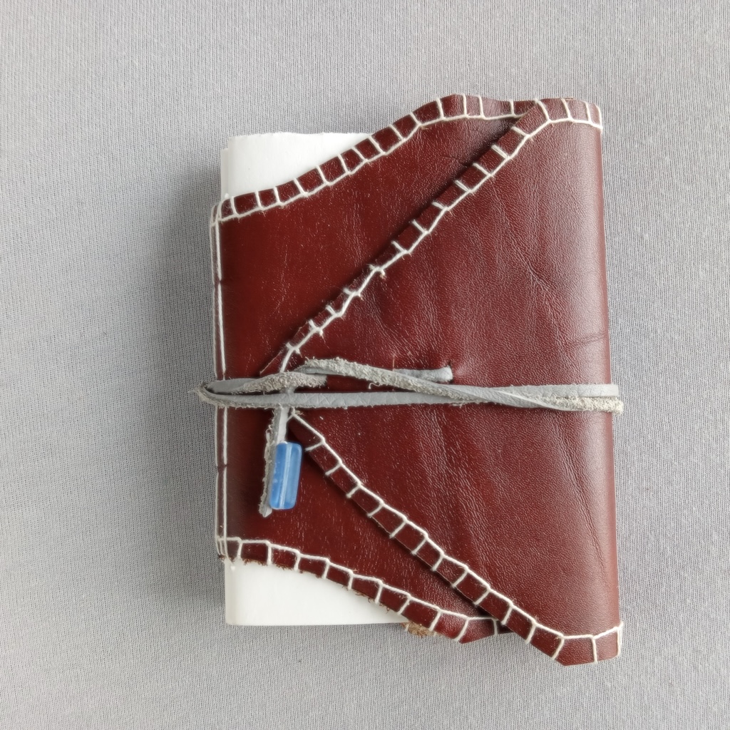 Journal en cuir, fabrication artisanale, entièrement fabriqué à la main, unique, papier 25% coton Eaton 60g, reliure long stitch, fermeture lanière grise et perle, 128 pages, format 11×15 cm;