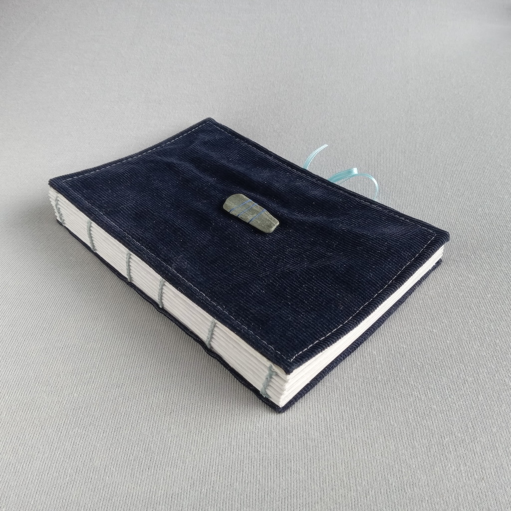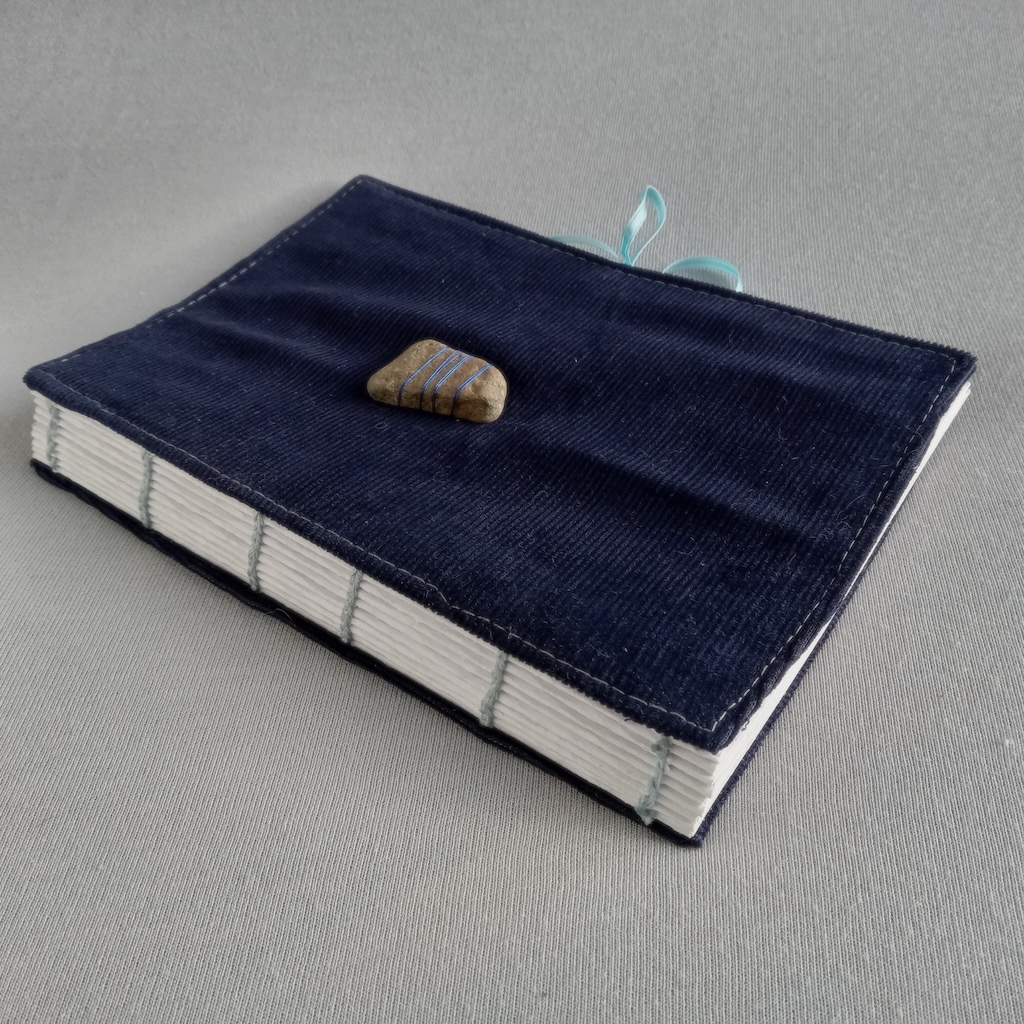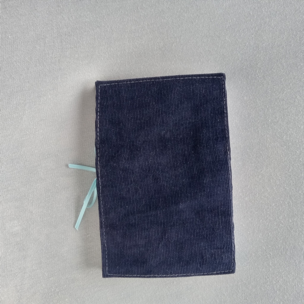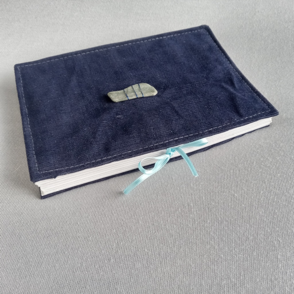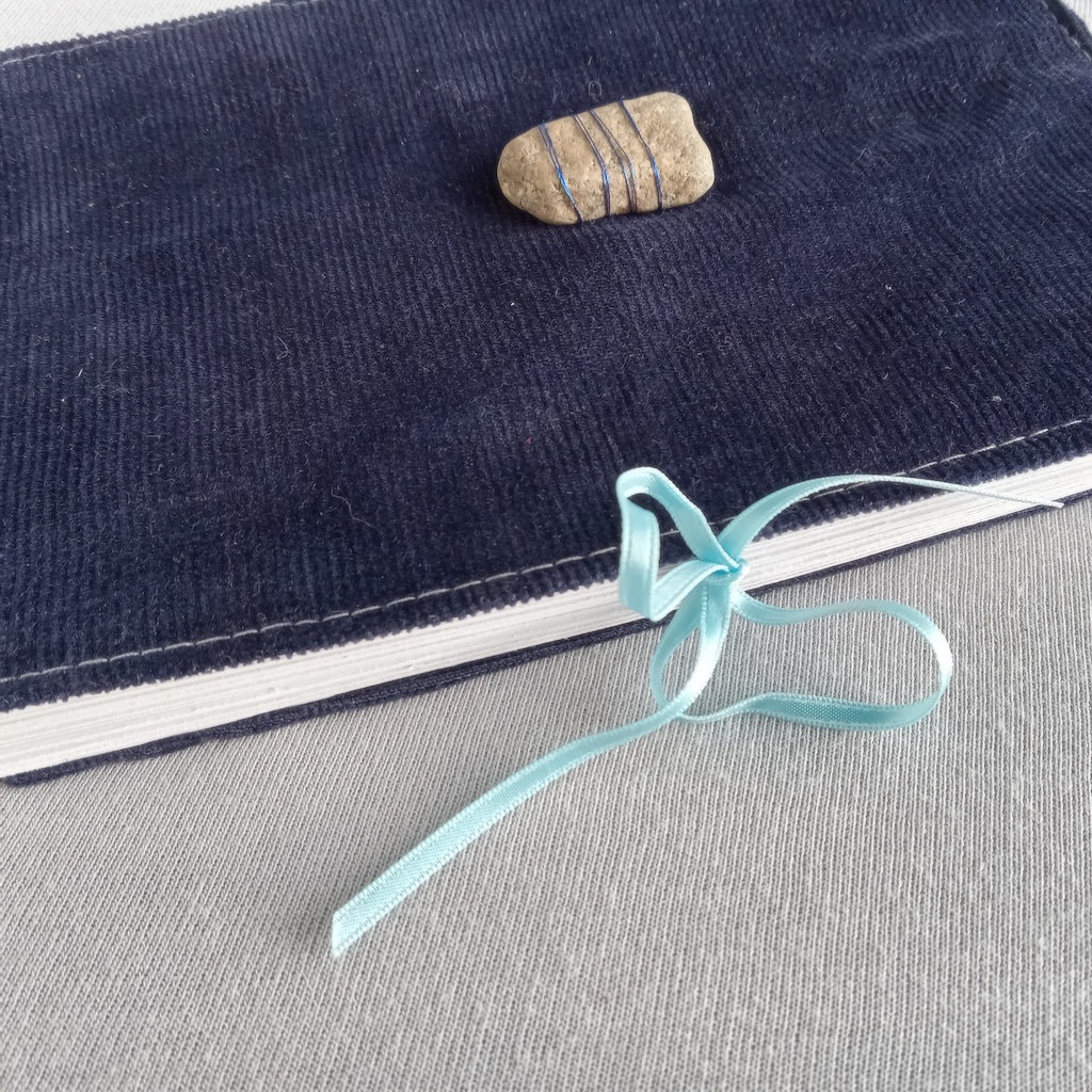 Journal, fabrication artisanale, entièrement fabriqué à la main, couverture tissus bleu foncé, intérieur papier 200g bleu/gris très clair, reliure copte, fermeture ruban, 70 pages, format 14×21 cm;