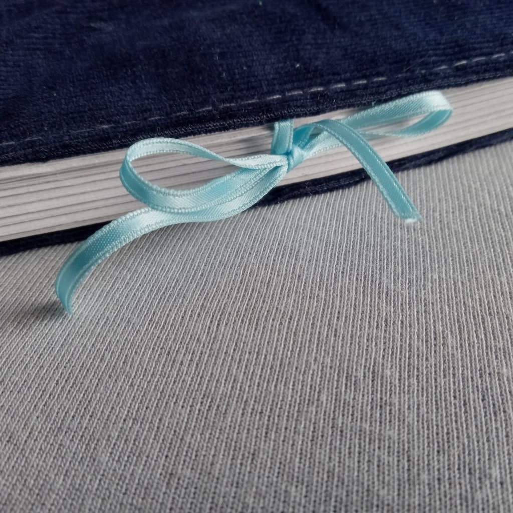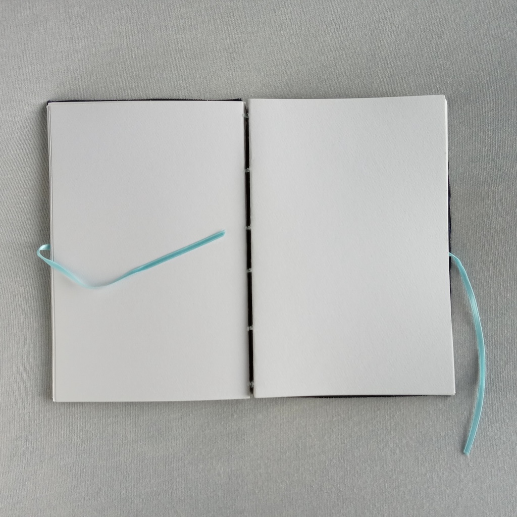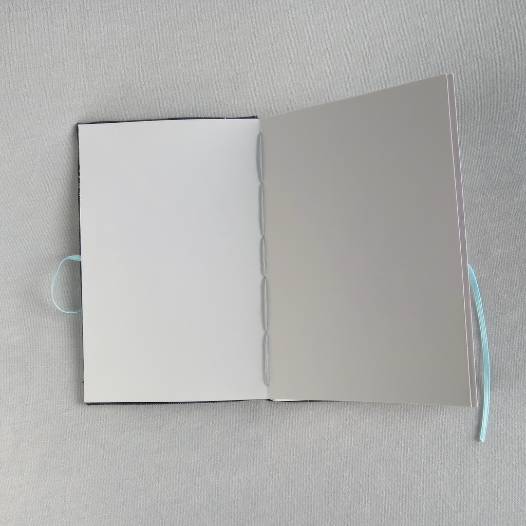 Journal, fabrication artisanale, entièrement fabriqué à la main, couverture tissus bleu foncé, intérieur papier 200g bleu/gris très clair, reliure copte, fermeture ruban, 70 pages, format 21×14 cm;
